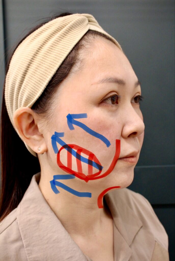 ほうれい線からマリオネットラインにかけてのたるみがあり、フェイスラインから口角にかけて脂肪があります。以前に脂肪吸引をお受けになったようですが、わりあい脂肪は残っており、吸引する余地がありました。他の投稿でも何度かお話ししているかもしれませんが、頬の脂肪吸引は吸引する範囲がとても重要で、フェイスラインから離れた部位まで吸引してしまうと頬がこけてしまいます。ですので、この斜線で示した部分を狙って吸引を行うことが大切です。