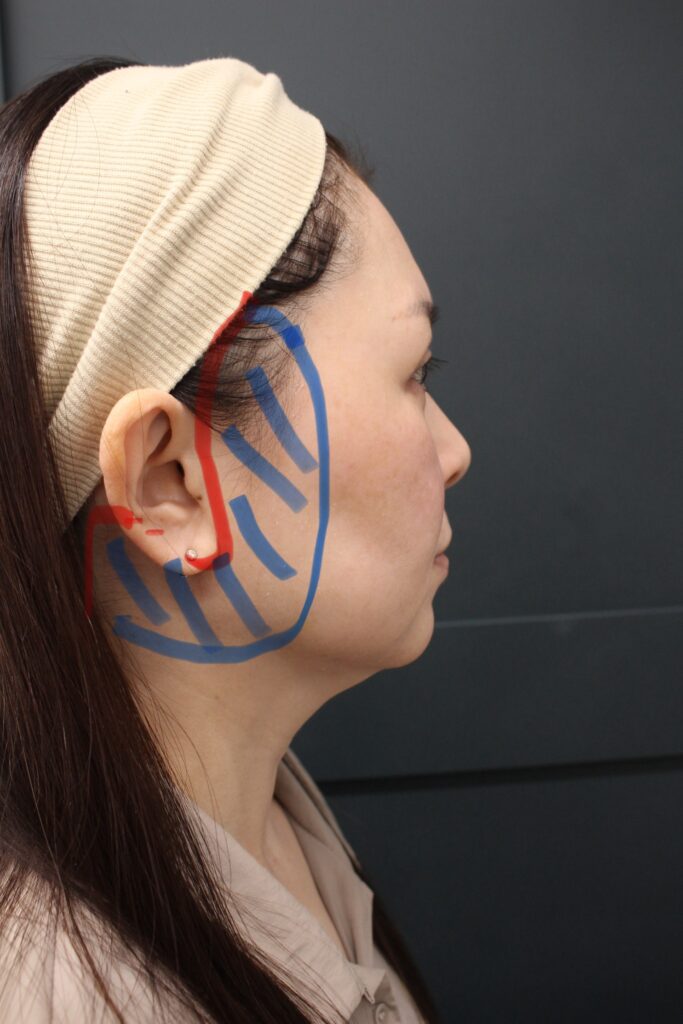 赤い線が切開線(耳のところは耳介側頭溝と言われるところを切開しており、耳は切っていません、念の為)で、青の斜線部分が剥離範囲です。この剥離範囲がSMAS層を引き上げるのに必要十分な範囲となります。これらの操作と頬の脂肪吸引を合わせました。