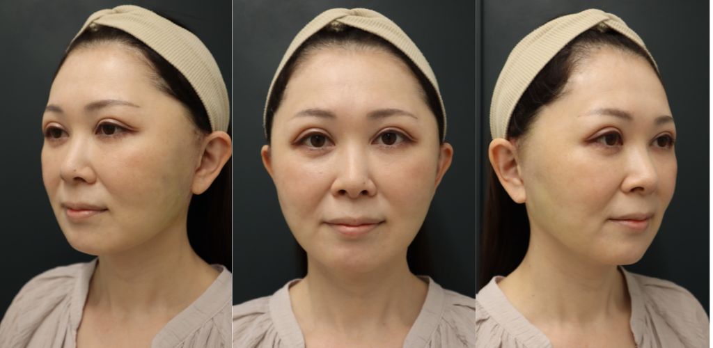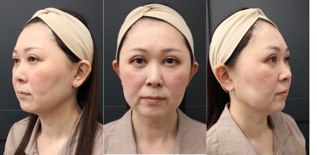非常に良い引き上がりです。かつ腫れの引き具合も良く、皮下出血斑(内出血)はさらに引きました。これで完成、と言ってもいいような経過ですが、まだむくみは多少ありますので、ここからまだ引き締まっていきます。ネックリフトを合わせたことで顎下のたるみも改善し、スマートなフェイスラインになっています。