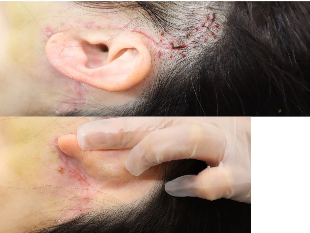 傷の様子です。上が髪の毛が生えている部分の傷で下が耳の後ろの部分の傷です。良好な経過と言っていいでしょう。抜鉤処置は問題なく終了しました。
