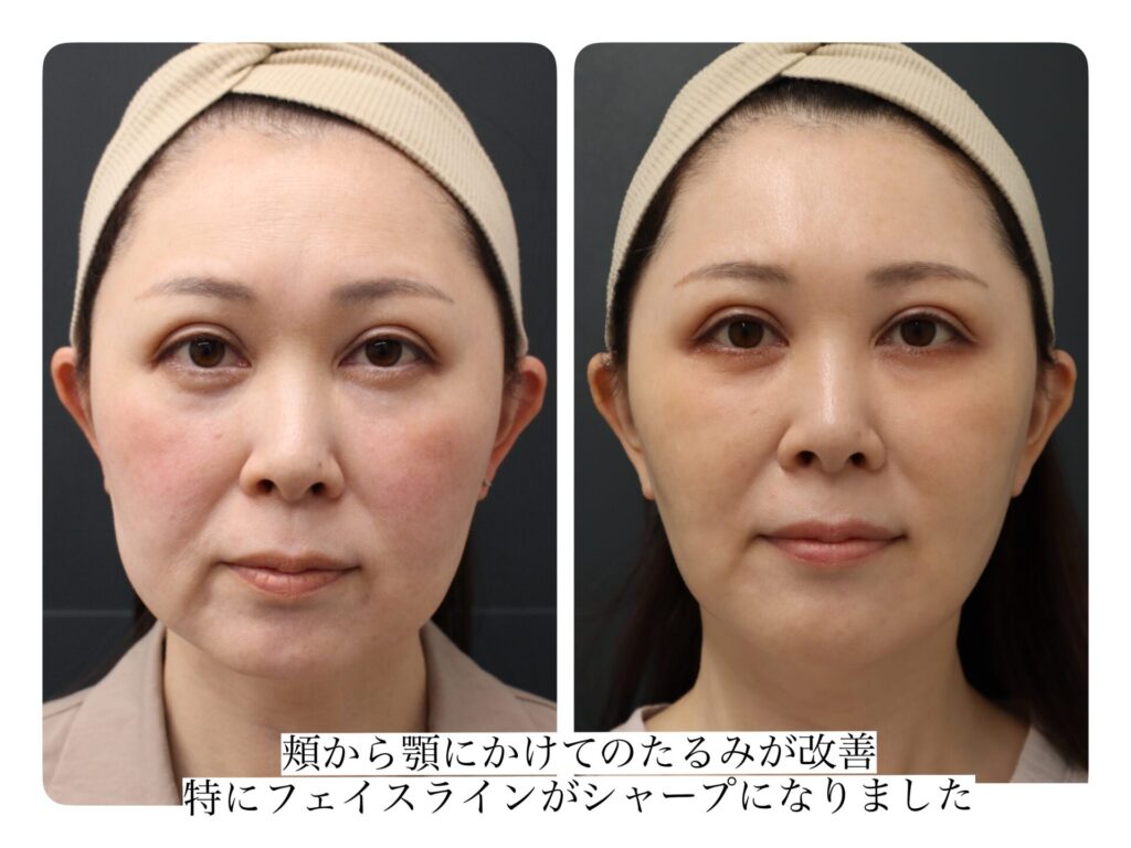 顔のたるみ、皮膚のたるみはもちろん改善しておりますが、やはり口元にかける脂肪を吸引したことで、輪郭は非常にシャープになりました。たるみで悩まれてるかたで口元の脂肪が気になると言う場合は、ご自身も自覚がおありのことも多くありますから、セットとして行うことの多い治療となります。中顔面から下顔面、特に下顔面の口の横のもたつきが気になる場合は、脂肪吸引も併用したフェイスリフト手術をご検討されてはいかがでしょうか?