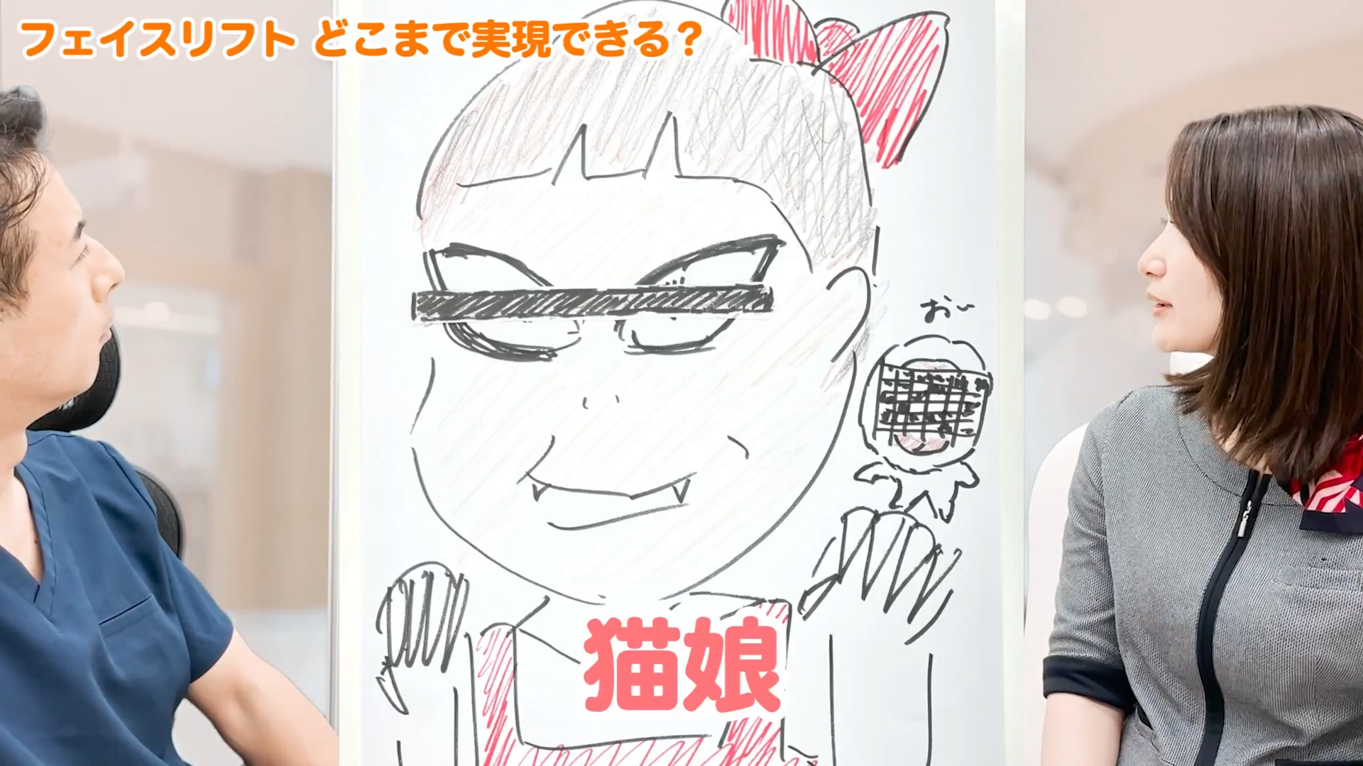 てんP:はい。これはあの版権の関係で、目にモザイクが入った感じになってますけれども、先生あの、いわゆる引っ張れるだけ引っ張って下さいっていう人たちの中に、猫娘って表現使う方がいらっしゃって、とにかくつり目になってでもいいから上げたいと。そうすると5?7年持つところが、10年15年持つんじゃないかと仰るんですね。実際どうなんでしょう?こめかみから耳の前からぶわー上に引っ張ったとして、こういう感じでつり目になりました。