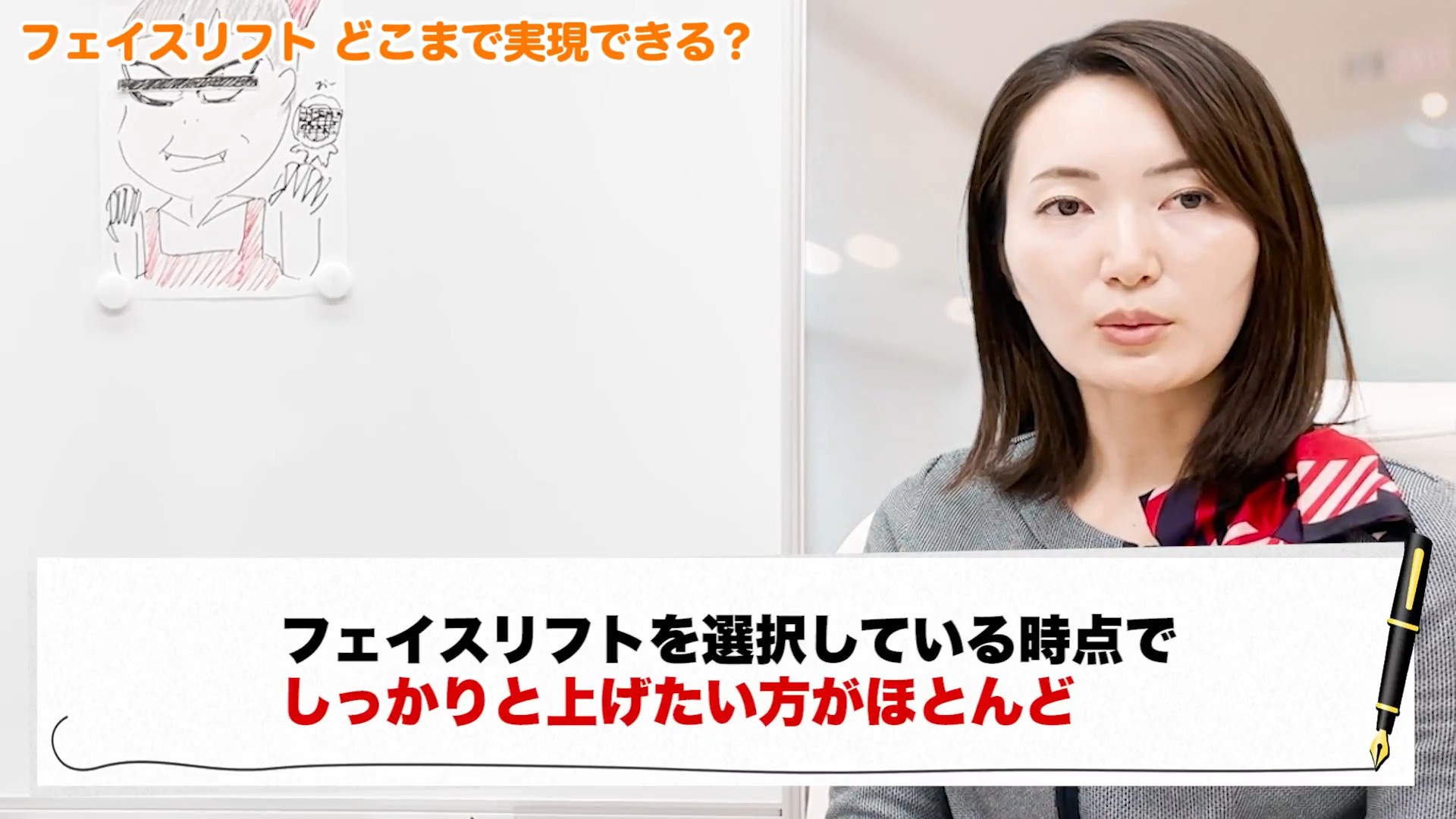 くらぬき:フェイスリフトを選択する時点で、ある程度上げて欲しいという希望の方が多いですよね。さりげなく上げたいんだったら、やっぱり溶ける糸とかウルセラを選ばれるので、フェイスリフトを選択してる時点でしっかり上げて下さいっていうリクエストの方が多いと思います。