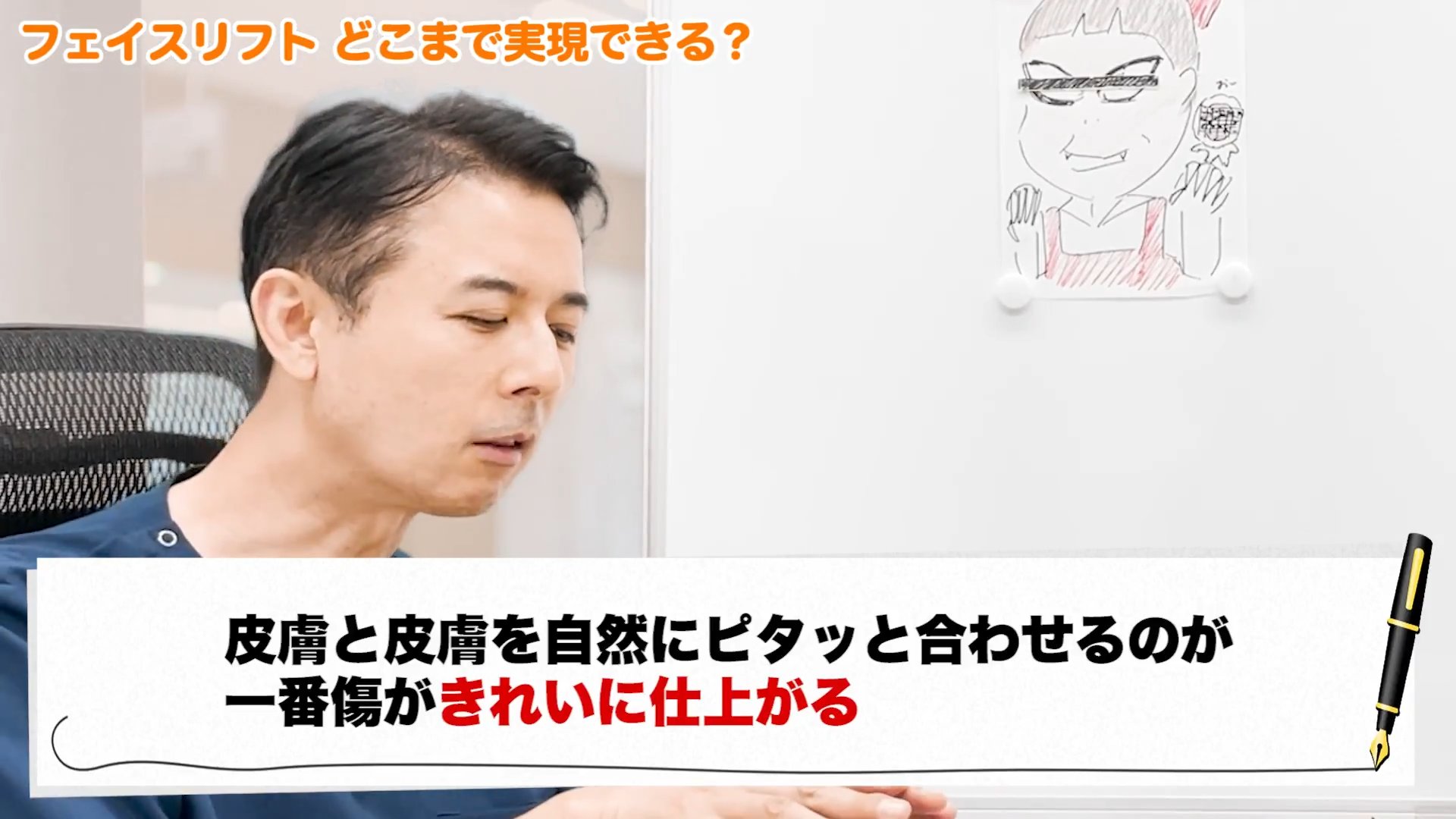 柴田医師:そうなんですよ。フェイスリフトって傷が基本リスク、前も言ったかもしれないですけど、自然にピタッと合わせるのが一番傷きれいになる。ニューって引っかかると、絶対目立つんです。それを今ちょっとグッと気味にやってるんです。