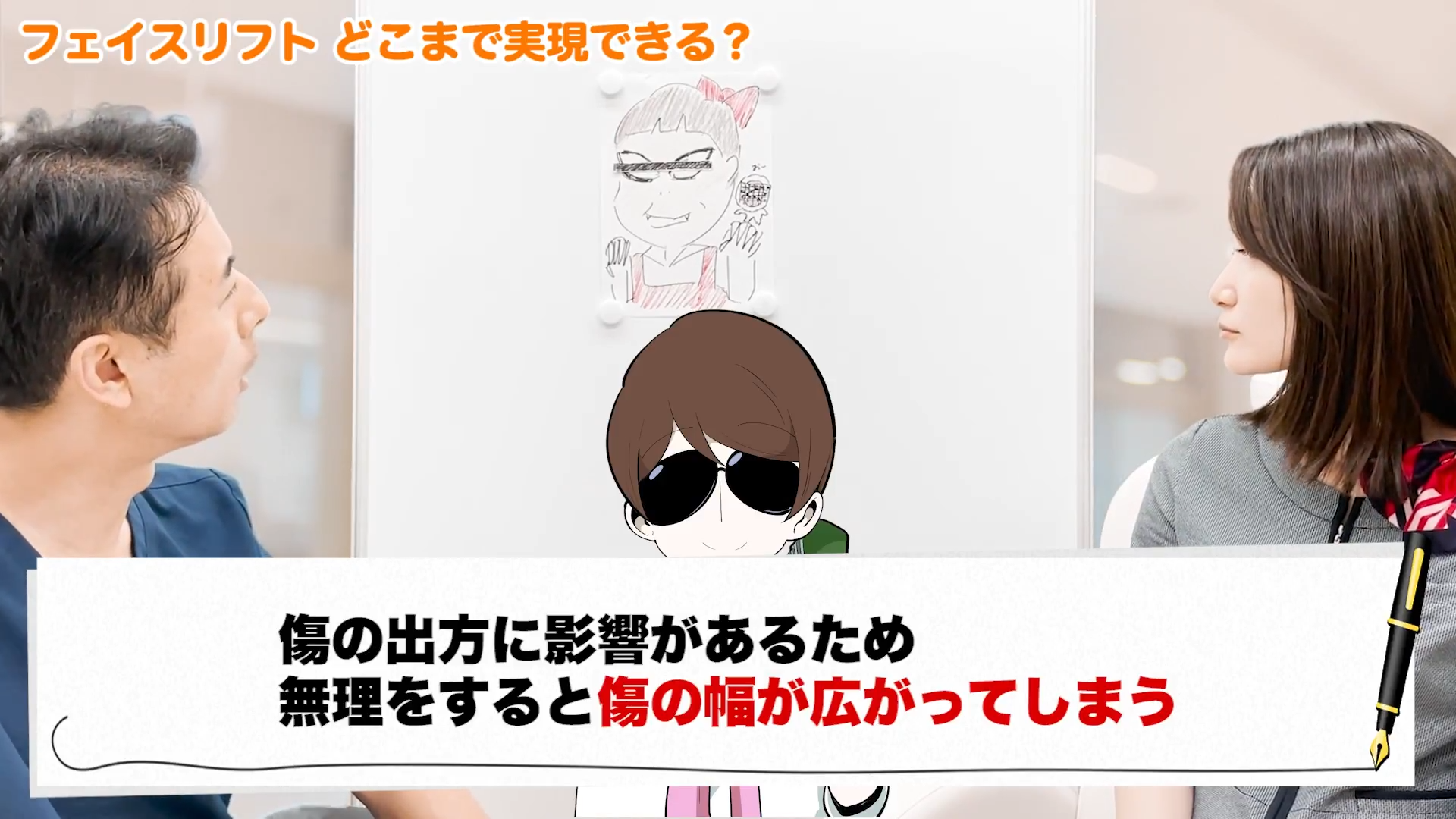 柴田医師:そうですね。だからまぁ、さっき言った傷の目立ち方は、影響があると思います。ギリギリで結局決めないといけないんですけども、無理すると傷の幅が広がります。