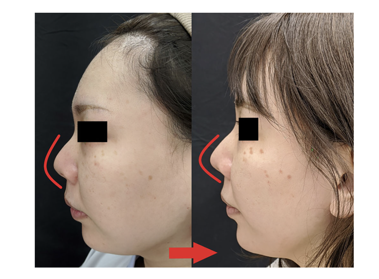 鼻筋ヒアルロン酸注入を受けたことによって、鼻根部から鼻先にかけて高さが出たのがわかります。さらに正面から見た際にもシュッと鼻筋が通り、横顔もきれいになりました。