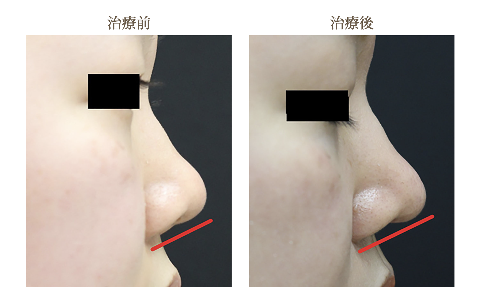 術前は横顔からわかるように鼻先が上を向き、正面から見ると鼻の穴が見えてしまうような鼻の形をしています。